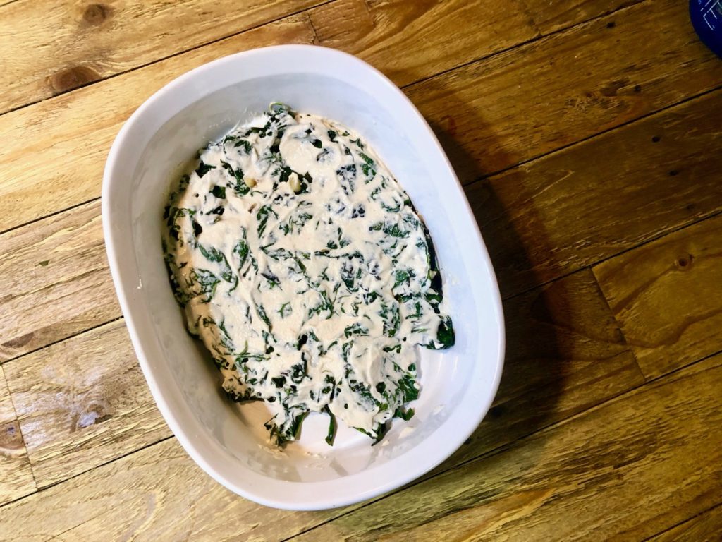 Cover with any creamy white sauce. We used a homemade cashew cream sauce, but you could easily use coconut cream, homemade sour cream, etc.
