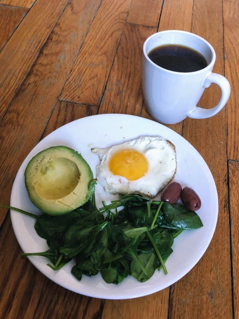 Breakfast 1-2 sunny side up eggs (depending on hunger level), big handful (1 cup?) of greens- lightly sautéed (often with a squeeze of lemon, or tomato or salsa- vitamin c to help absorption, and half an avocado, a small amount of something probiotic (sauerkraut, pickles, yogurt), and black coffee. Several days a week I also have some type of meat in the morning.